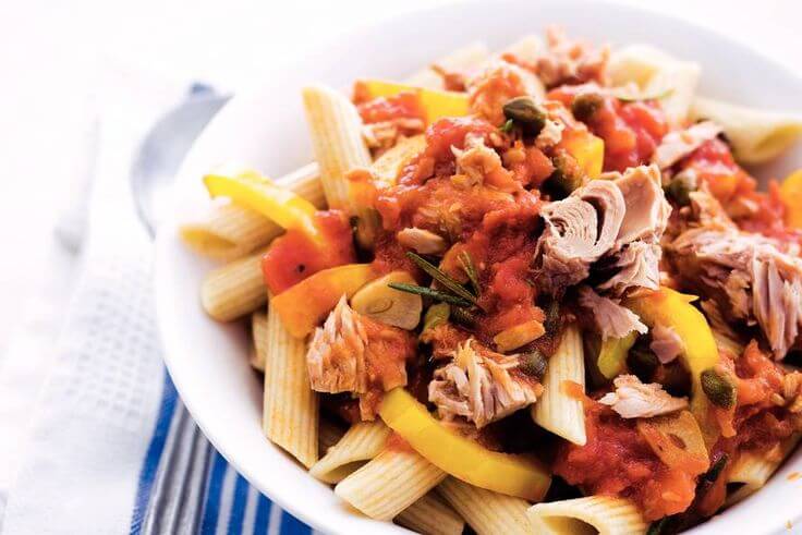 Met tonijn, tomaat, ui en kappertjes