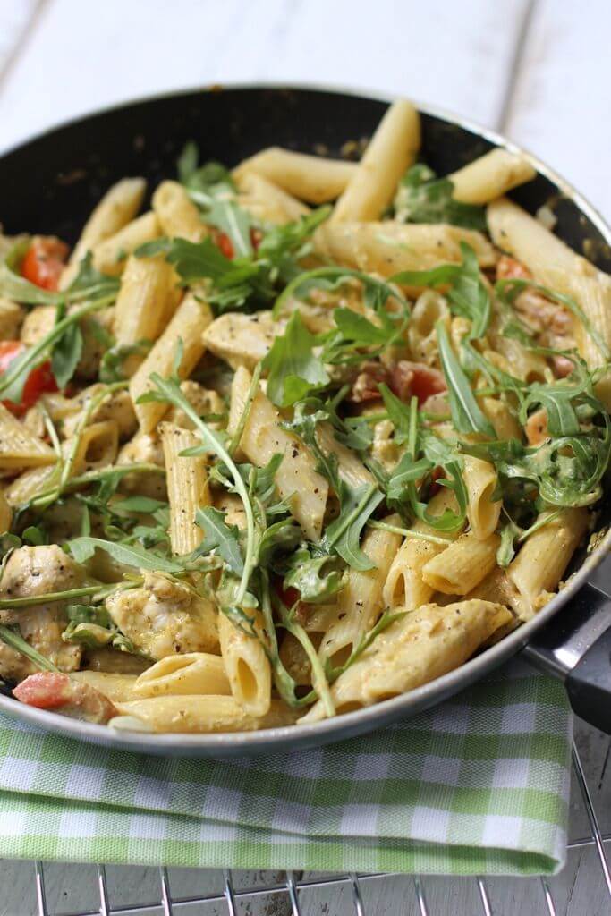 met rucola, pijnboompitten, parmezaanse kaas en citroendressing